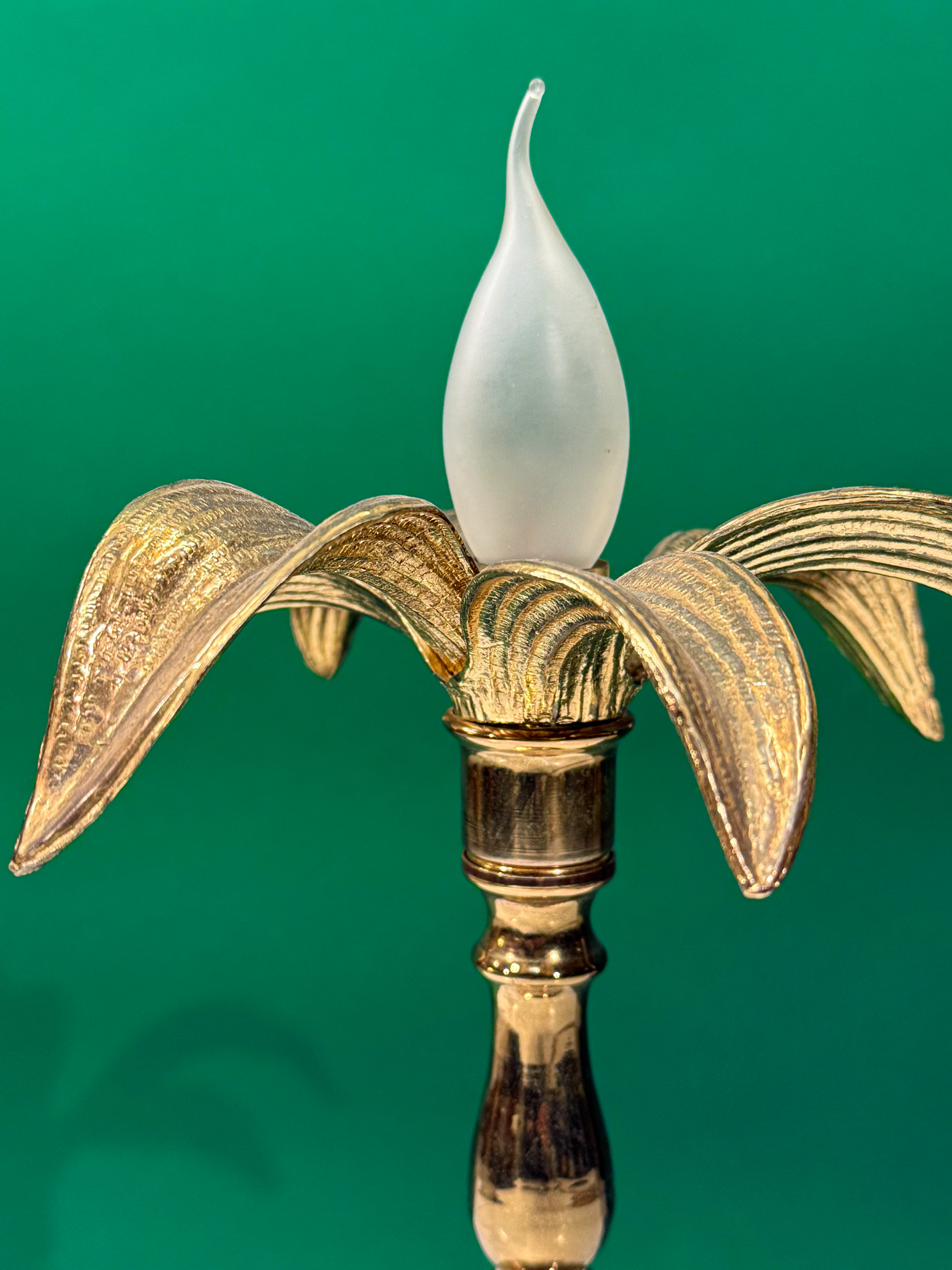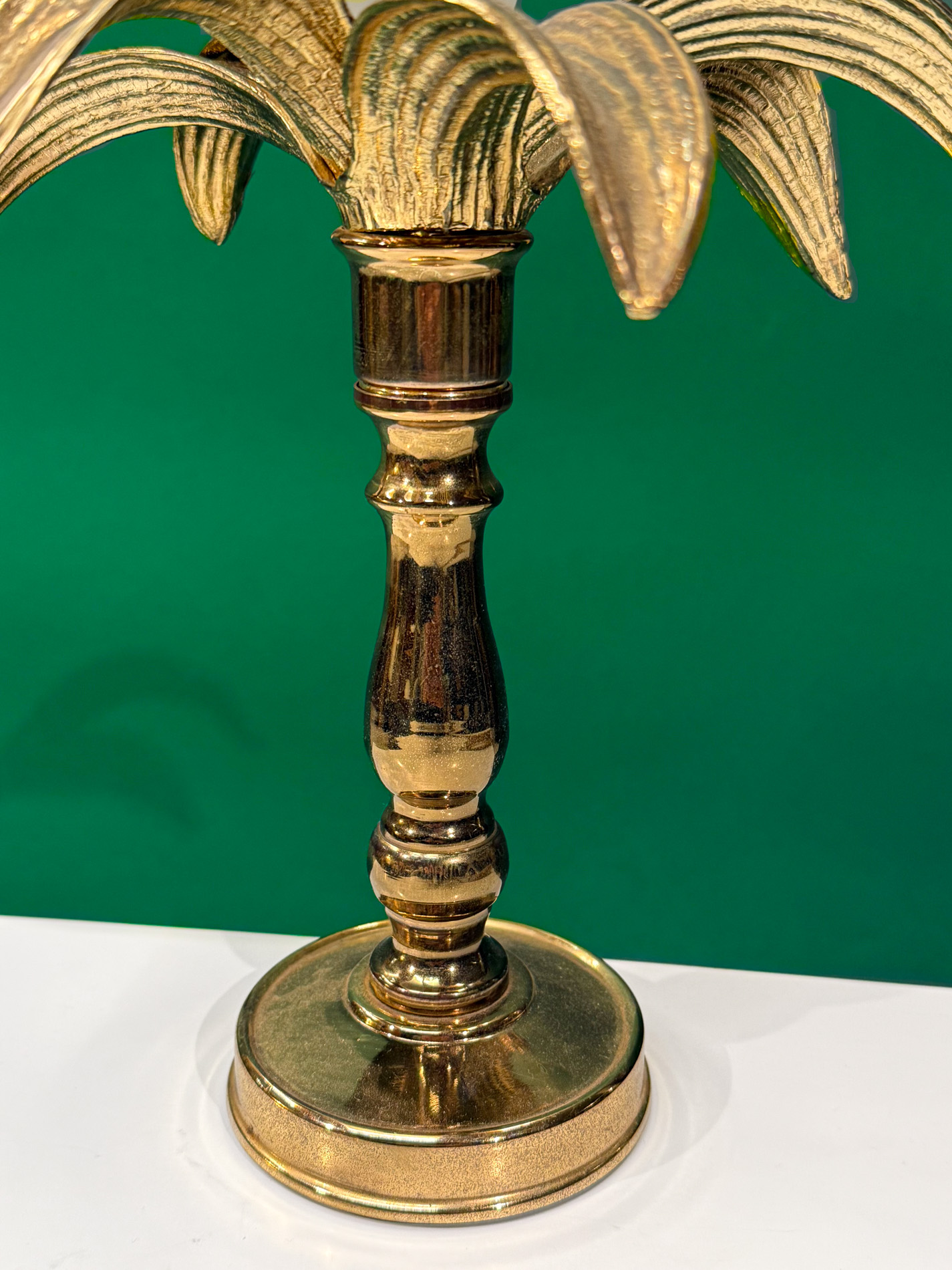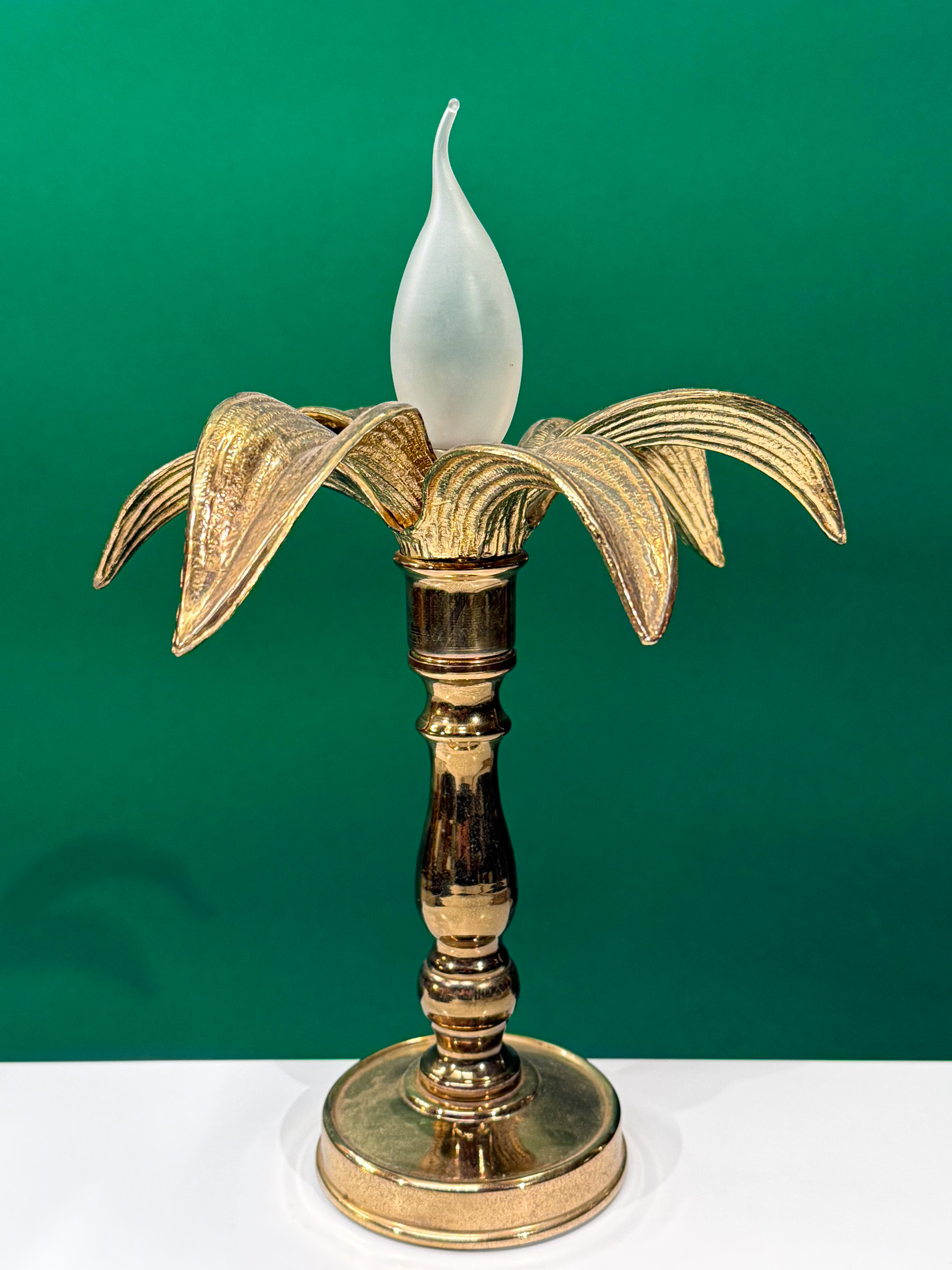 A striking gold metal lamp from the renowned brand Massive brings a warm, elegant glow to any interior. Its refined finish pairs beautifully with a charming small palm tree crafted in Regency style, creating a timeless, luxurious accent that instantly elevates your space.