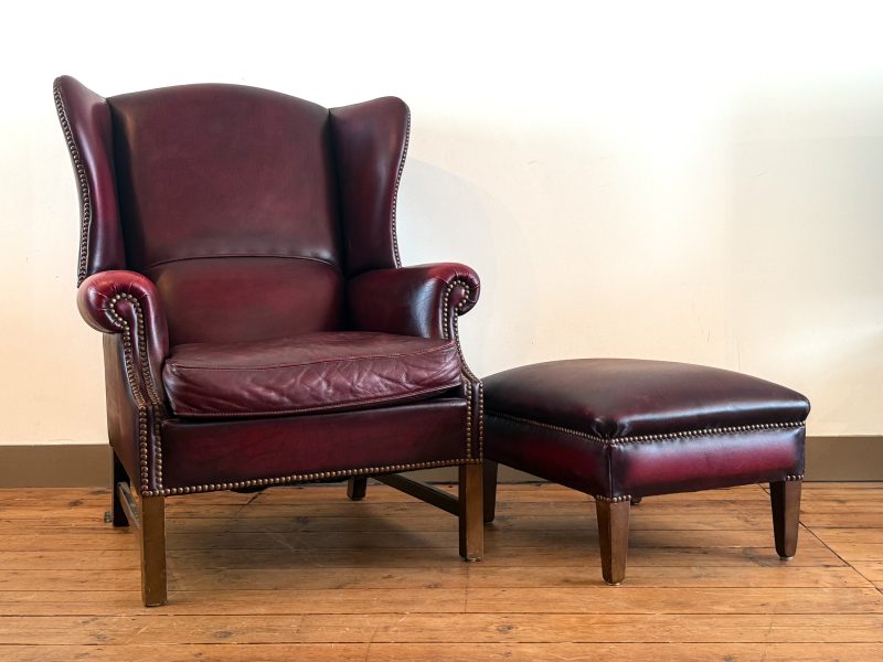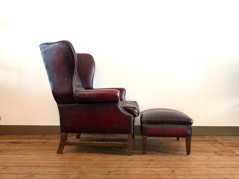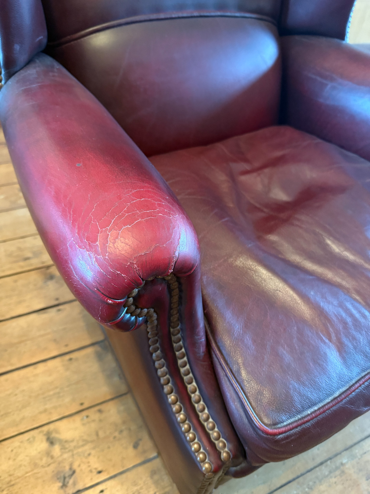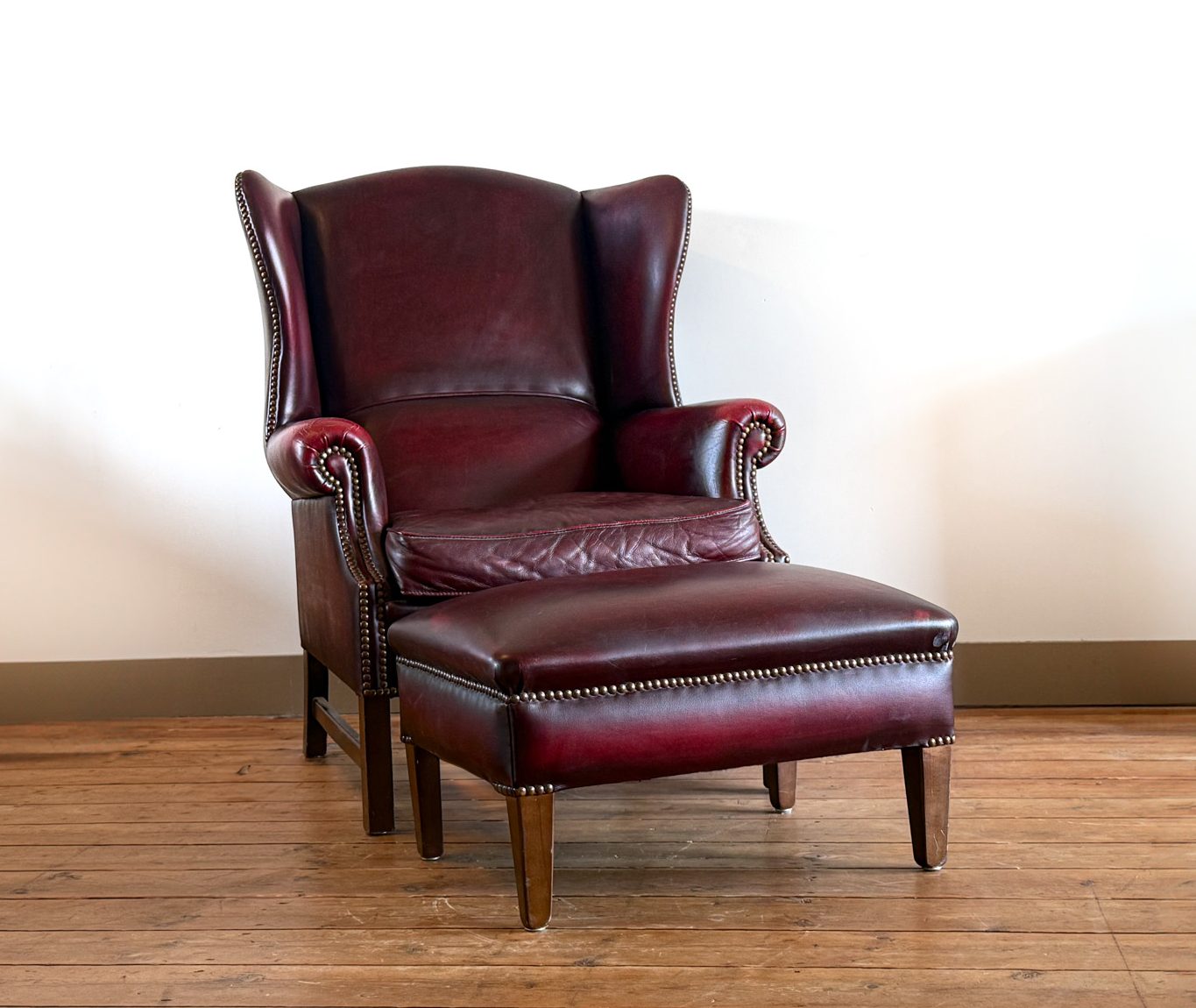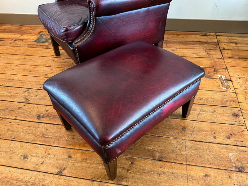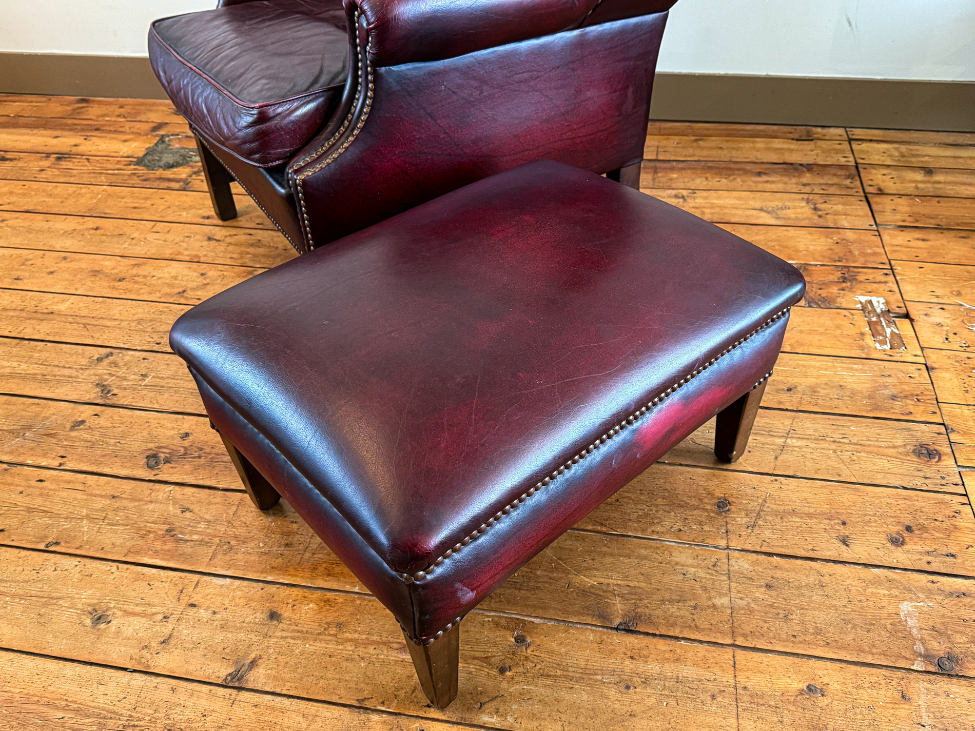 Solid red leather Chesterfield armchair by Belgian brand Muylaert, including matching ottoman. Made from thick, high-quality leather with the classic buttoned design. Comfortable seating, suitable for everyday use.