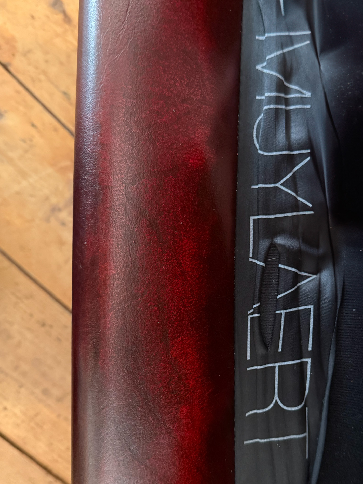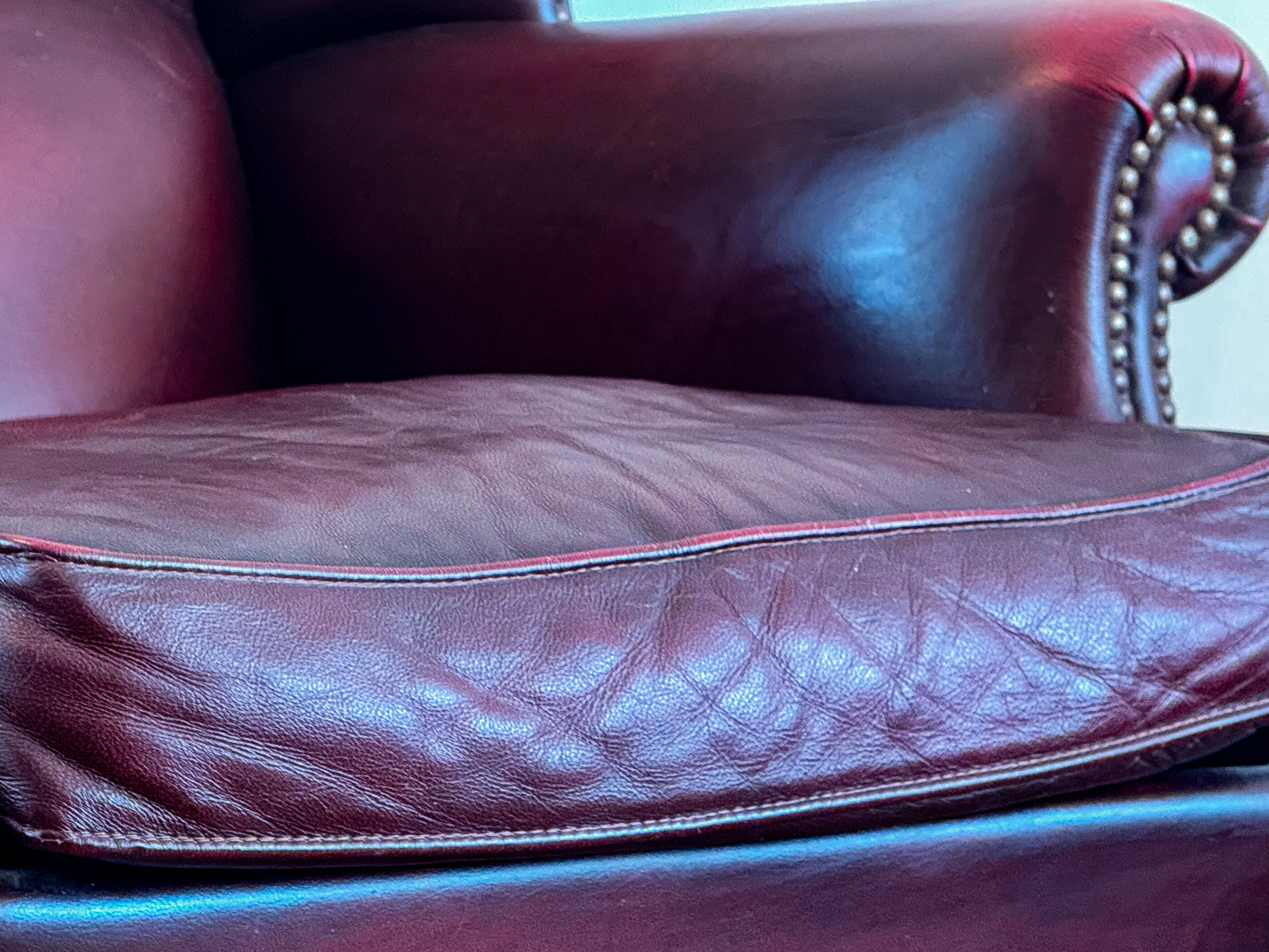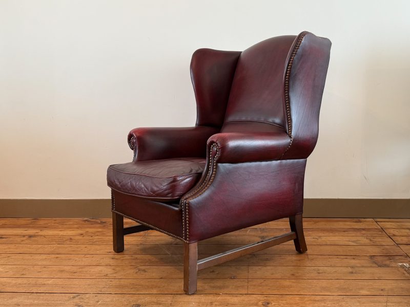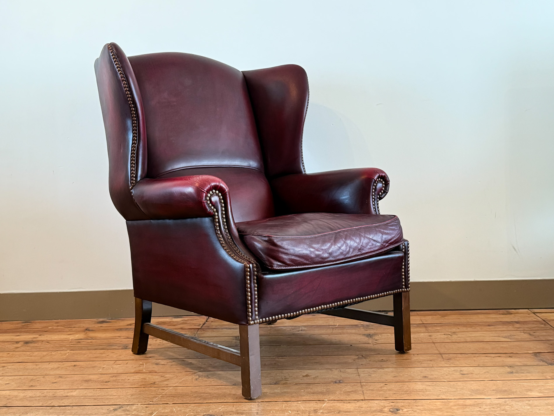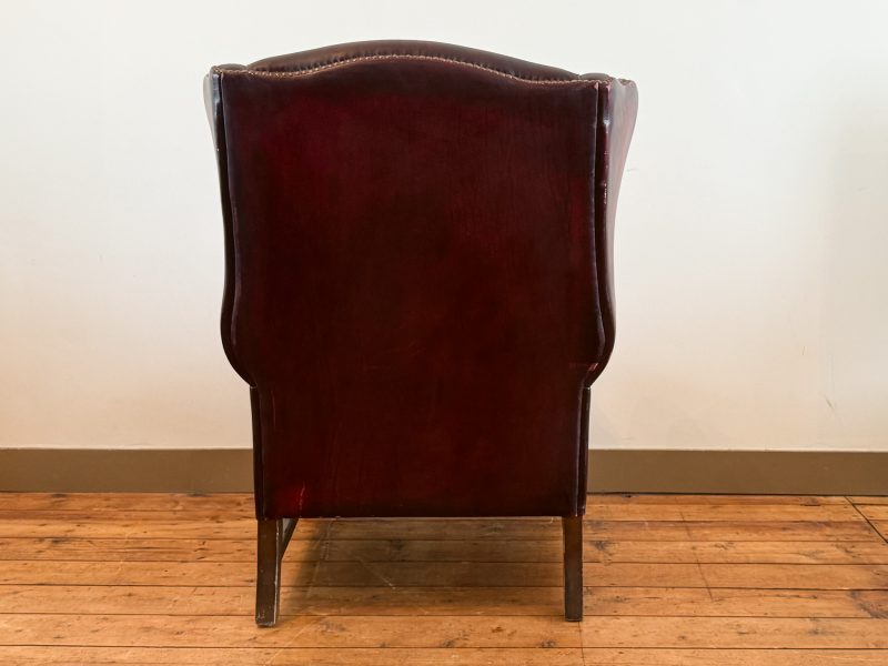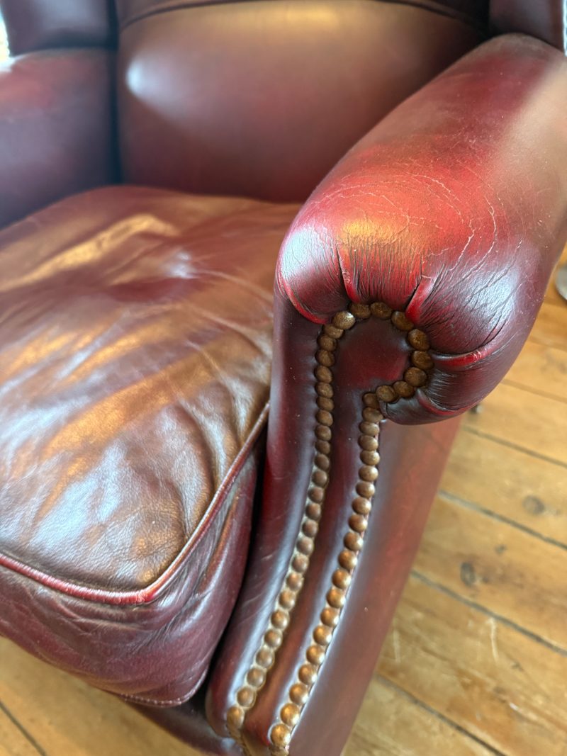Solid red leather Chesterfield armchair by Belgian brand Muylaert, including matching ottoman. Made from thick, high-quality leather with the classic buttoned design. Comfortable seating, suitable for everyday use.