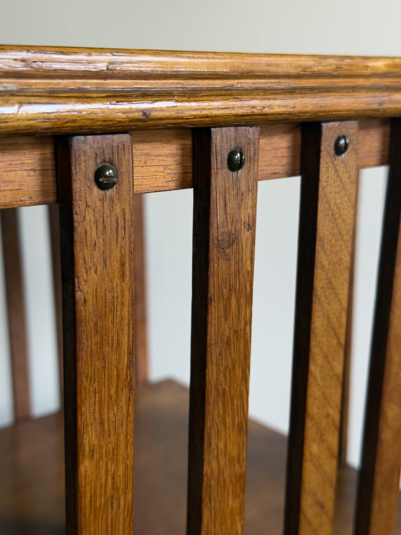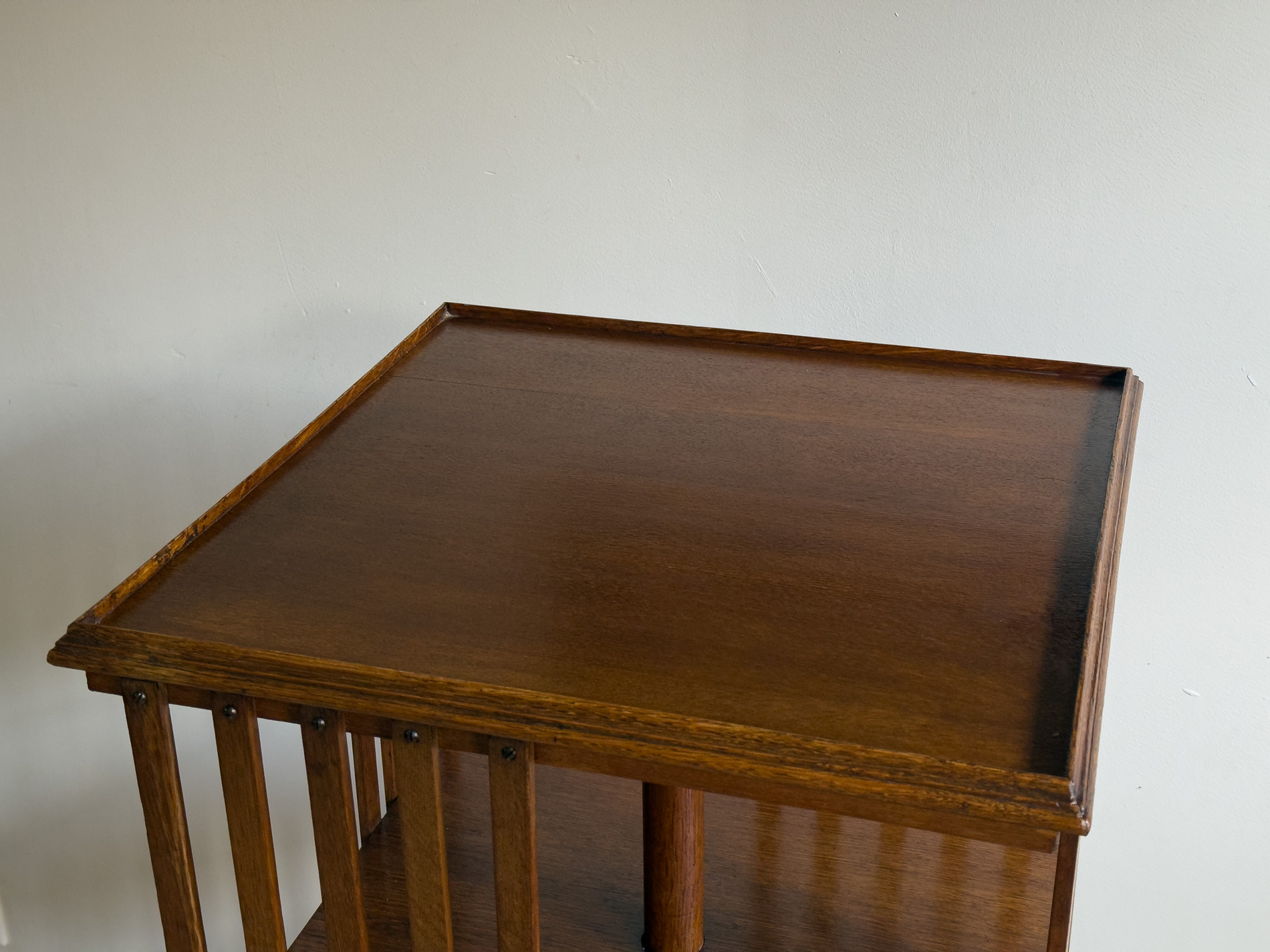 Beautiful solid oak bookmill (revolving bookcase) with a timeless, classic appearance. This piece features three spacious tiers, providing ample room for books, magazines, or decorative items, plus an additional top platform ideal for displaying a plant, sculpture, or other accent piece.