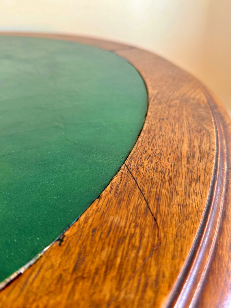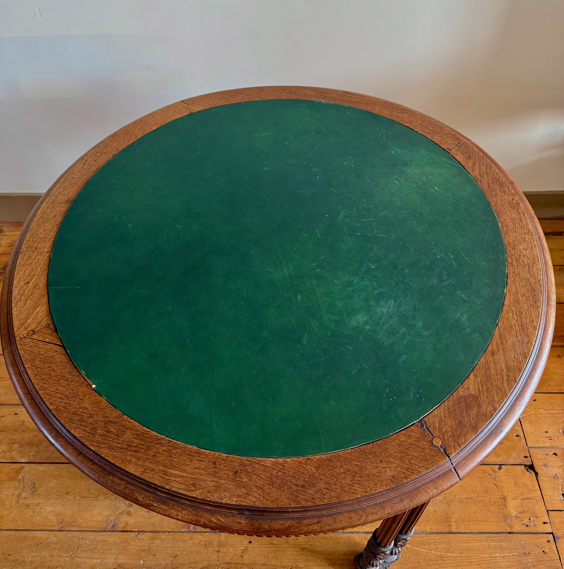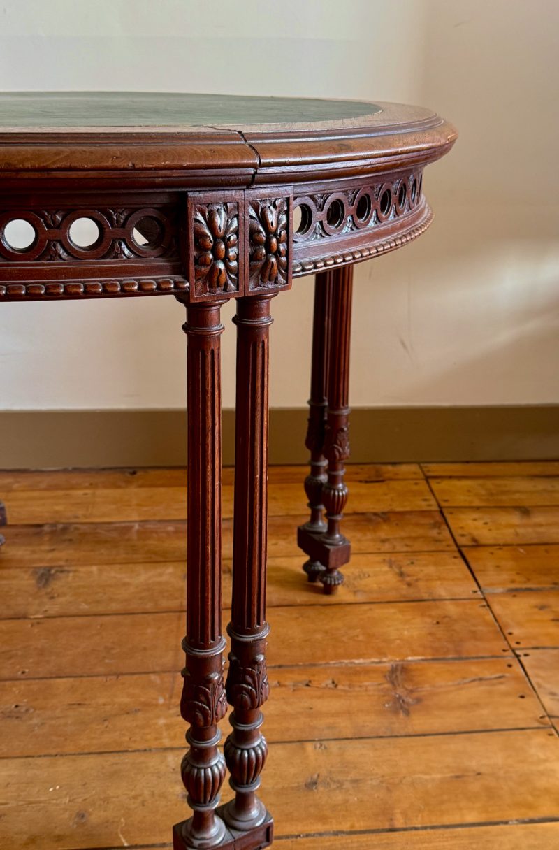 19th-century library table/writing desk is a beautiful example of classic craftsmanship. The round top is inlaid with green leather, a characteristic feature often found in writing desks from this period. The openwork edge and refined wood carvings give the piece an elegant and timeless appearance.